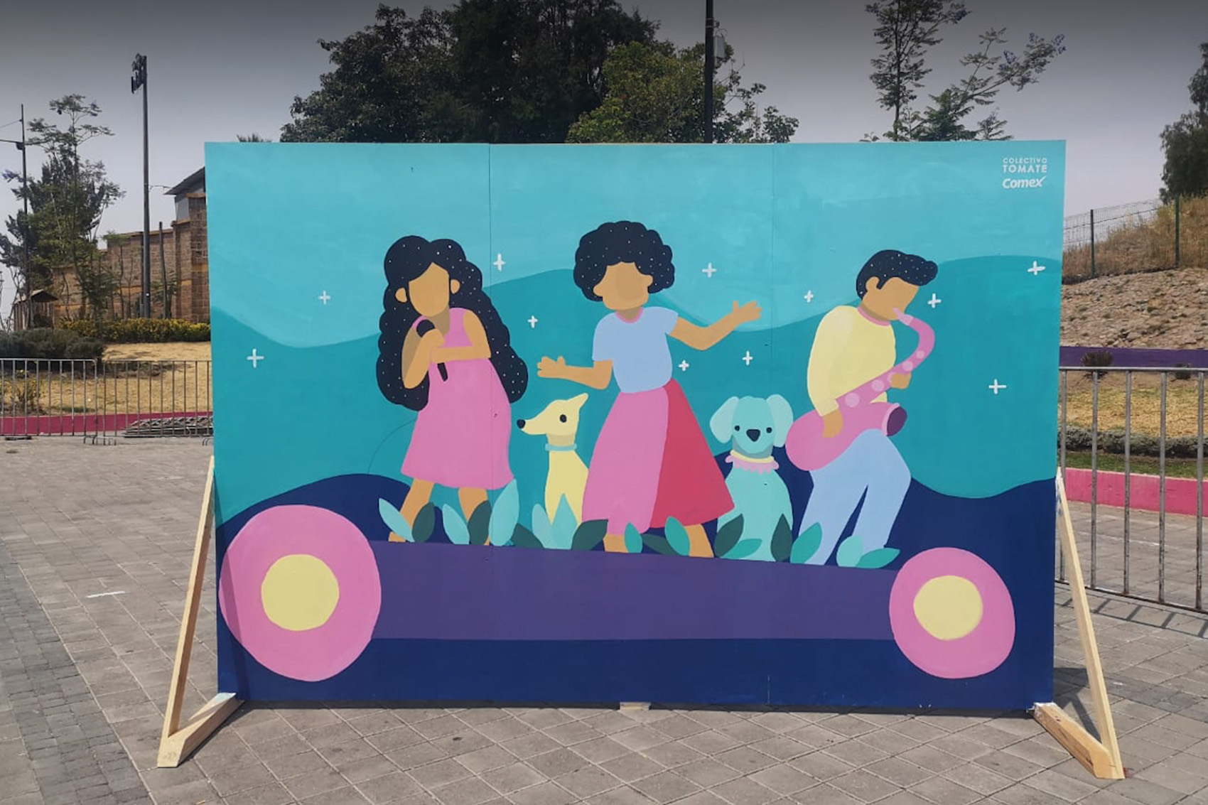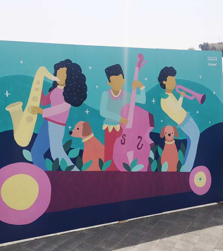 El mural representa a un grupo musical que interpretan alegremente alguna melodía al son una una noche estrellada. El trabajo estuvo a cargo de Alva, un artista urbano invitado por Colectivo Tomate, junto con el apoyo de miembros del equipo.