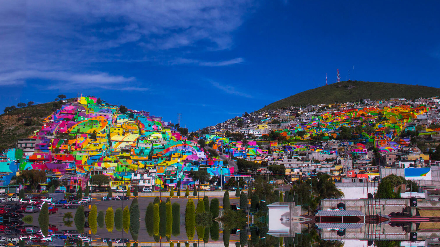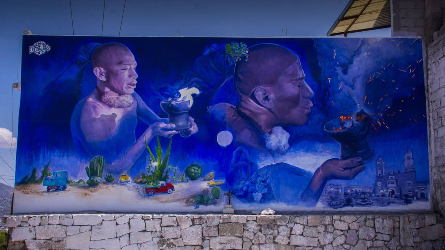 De acuerdo con la cosmogonía prehispánica, los cerros son los lugares de donde brota la vida y en honor a ello, los artistas que conforman al Colectivo Germen, diseñaron un macro mural que en conjunto representa al viento a través de formas curvilíneas que cubren cada una de las casas, simbolizando el aliento de vida de sus habitantes. El resultado es una intervención que abarcó 20 mil m2 en el caso de Palmitas,12 mil m2 en la continuación del mural hacia el Cerro de Cubitos y otros 8 mil m2 más del programa “Pintando tu Casa”.